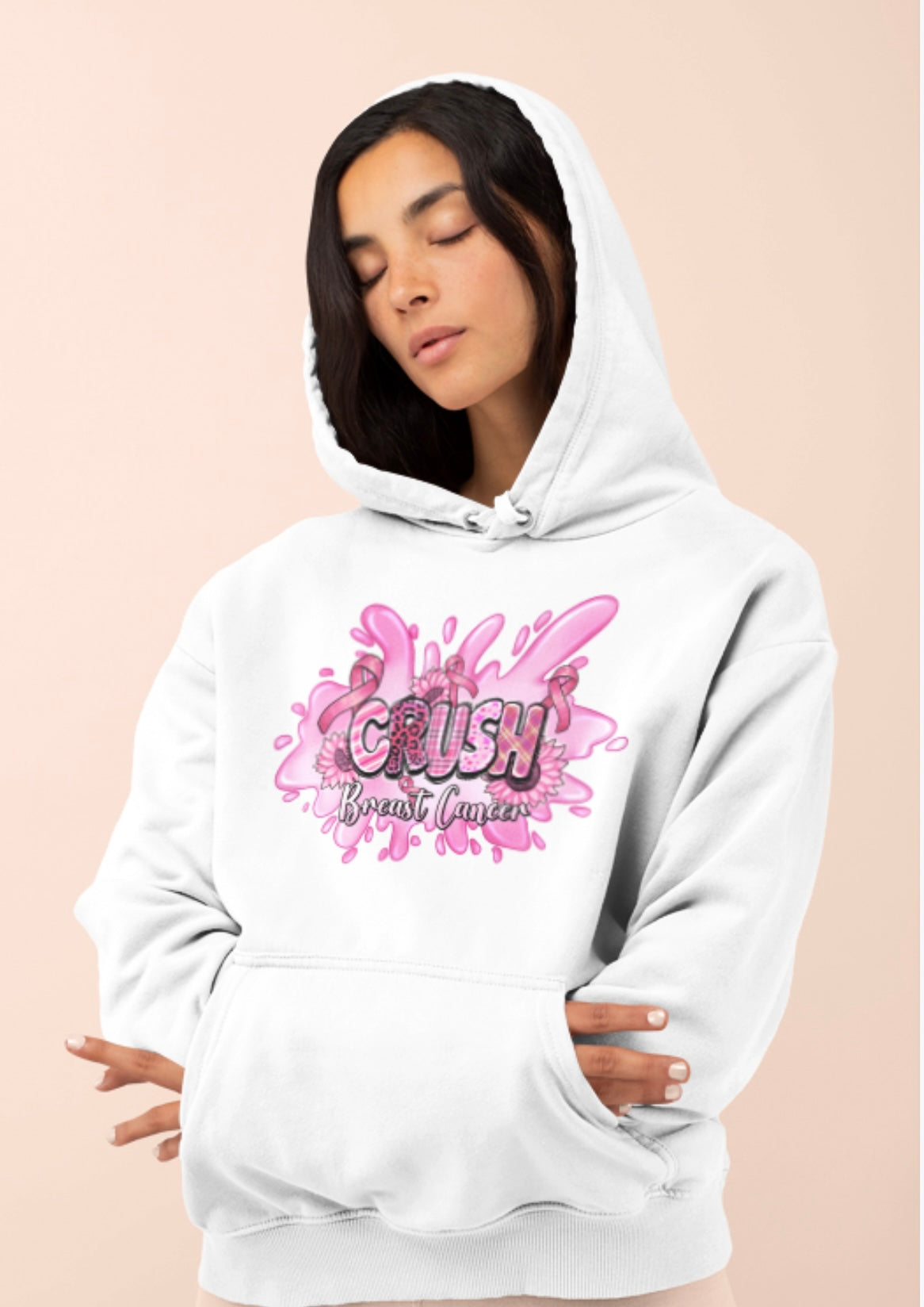 Unisex Classic cozy Hoodie Our Bursting Crush Cancer design in the front to promote Breast Cancer Awareness